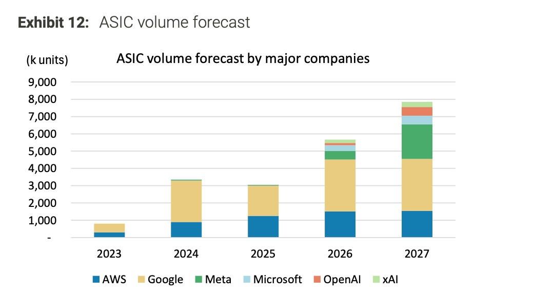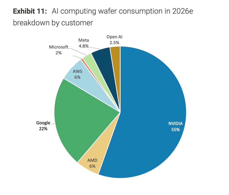 Şirketler de GPU ihtiyacını azaltmak adına ASIC (Özelleşmiş Çip) üretimini artırıyor. ASIC hacmi 2023’te 1.5 milyondan 2027’de 8.5 milyona yükselecek. ASIC projeleri ayrı mask setleri ve front-end slotları gerektirdiğinden ve GPU ile aynı hattı paylaştığından 3nm kapasitesine wafer tarafında ikinci bir talep dalgası yaratıyor.