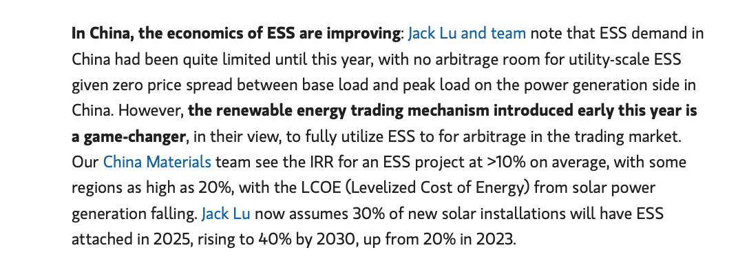 Morgan Stanley'nin konuyla ilgili raporunda da Çin’de yeni kurulan güneş kapasitesinin yüzde 30’unun ESS ile entegre edileceği not ediliyor. Bu oran 2030’da yüzde 40’a çıkabilir.