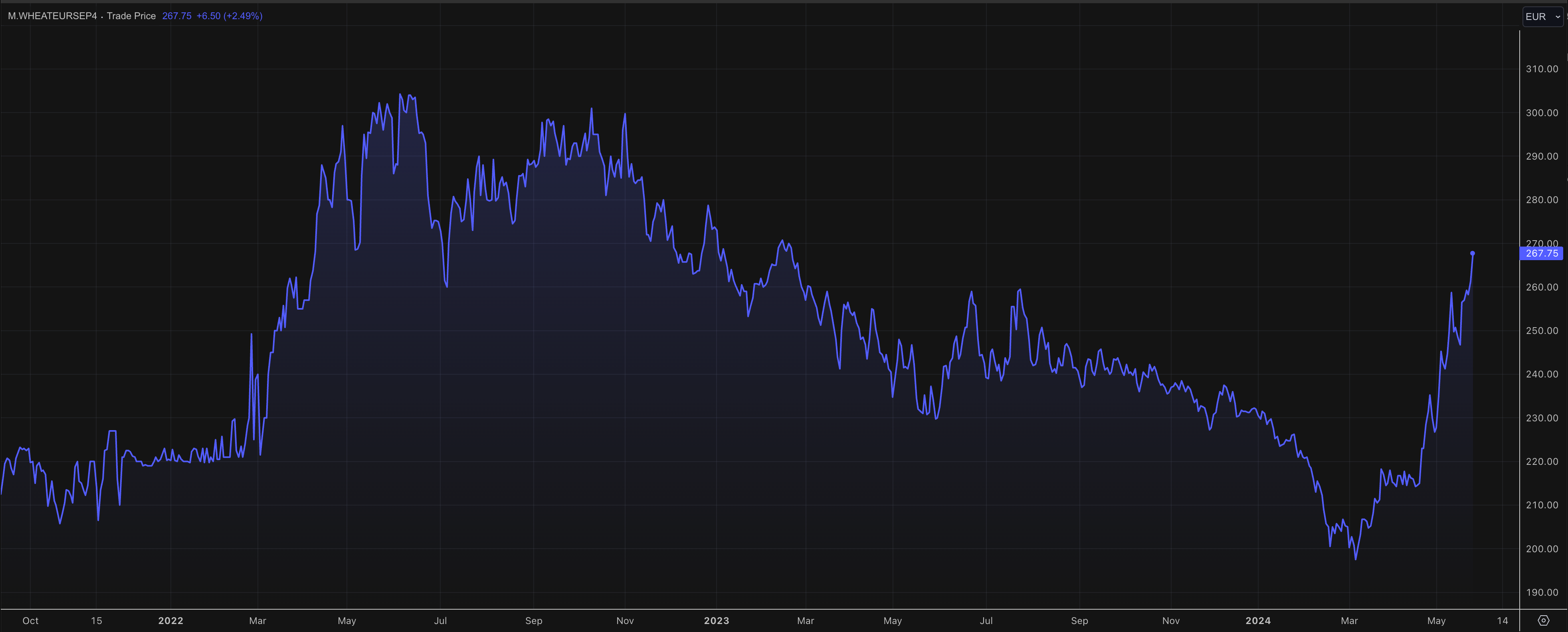 ➖ Avrupa’da buğday vadelileri son bir yılın en yükseğinde. Paris’te 267 avroya yükseldi. Grafikte görüleceği gibi mart başında 200’ün altına kadar inmişti. Yalnızca Mayıs ayında %20’ye yakın yükselmiş oldu. Rusya’nın güneyi ana faktör. Yağışlar yetersizdi. Don vurdu vs. Rekolte tahminleri haftalardır aşağı revize ediliyor. IKAR bugün en son 81.5 milyon tona çekti. Üretim iki yıldır 90 milyon tonun üstündeydi.