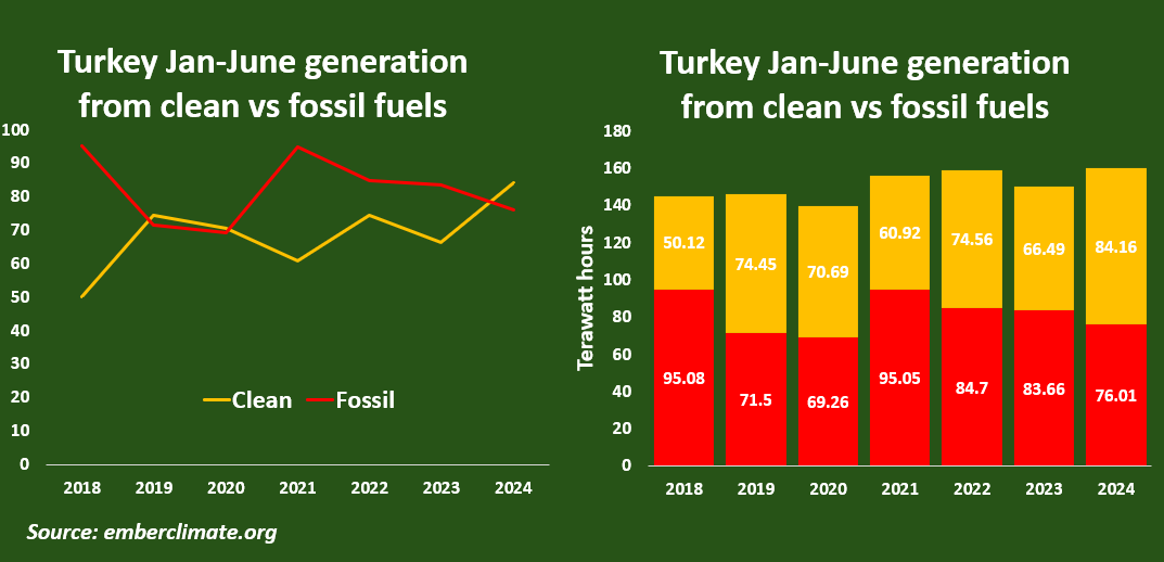Rapora göre temiz enerji kaynaklarının elektrik üretimindeki payı 2024’ün ilk yarısında %53’le rekor kırdı. Oran geçen senenin aynı döneminde %44’tü.