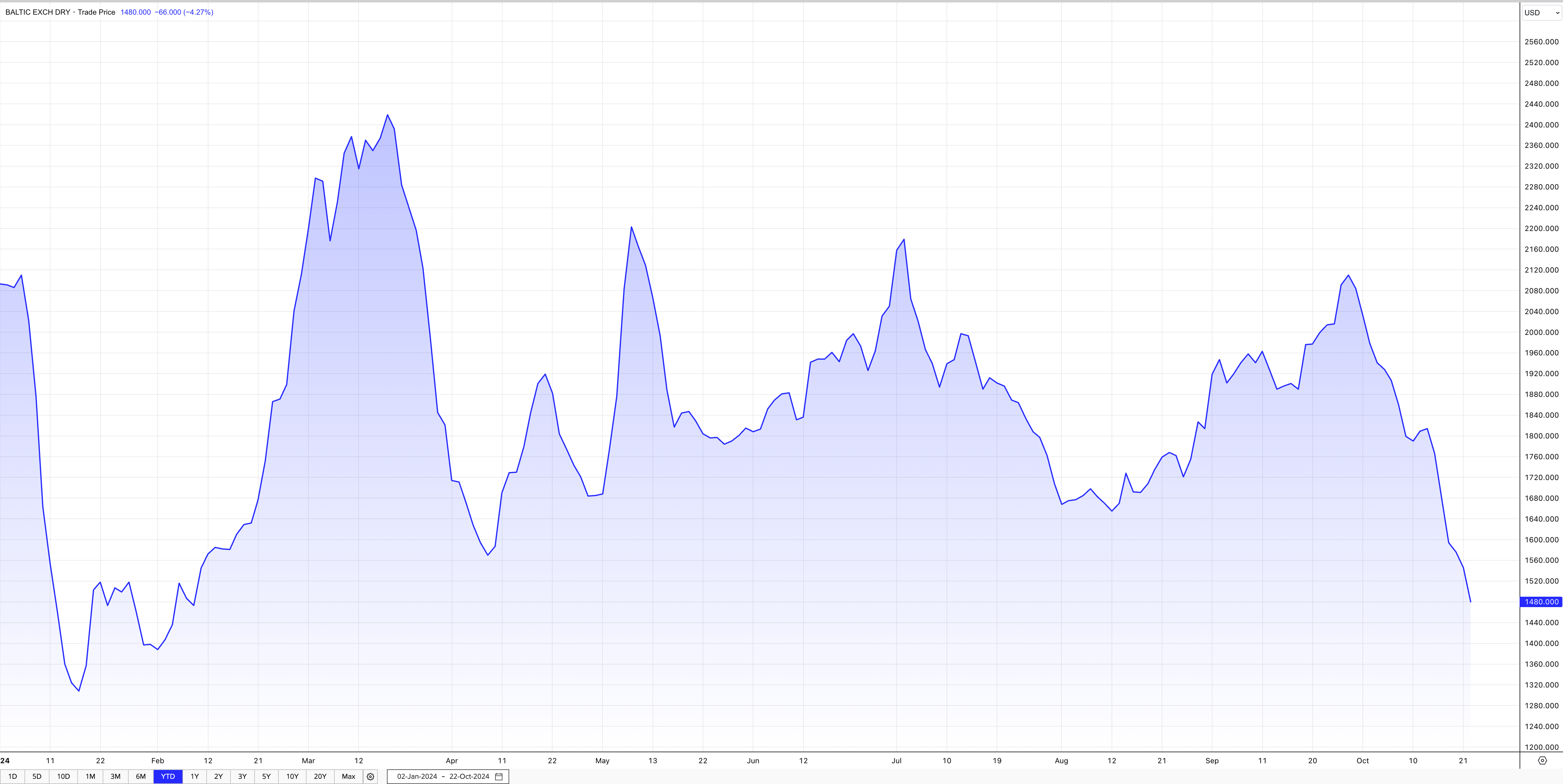 Baltık Kuruyük Endeksi Şubat ayından beri en düşük seviyelerine indi. Endeksin en önemli kalemi Capesize tarafında da benzer seyir var, tipik olarak 150 bin ton cevher taşıyabilecen gemi sınıfında.