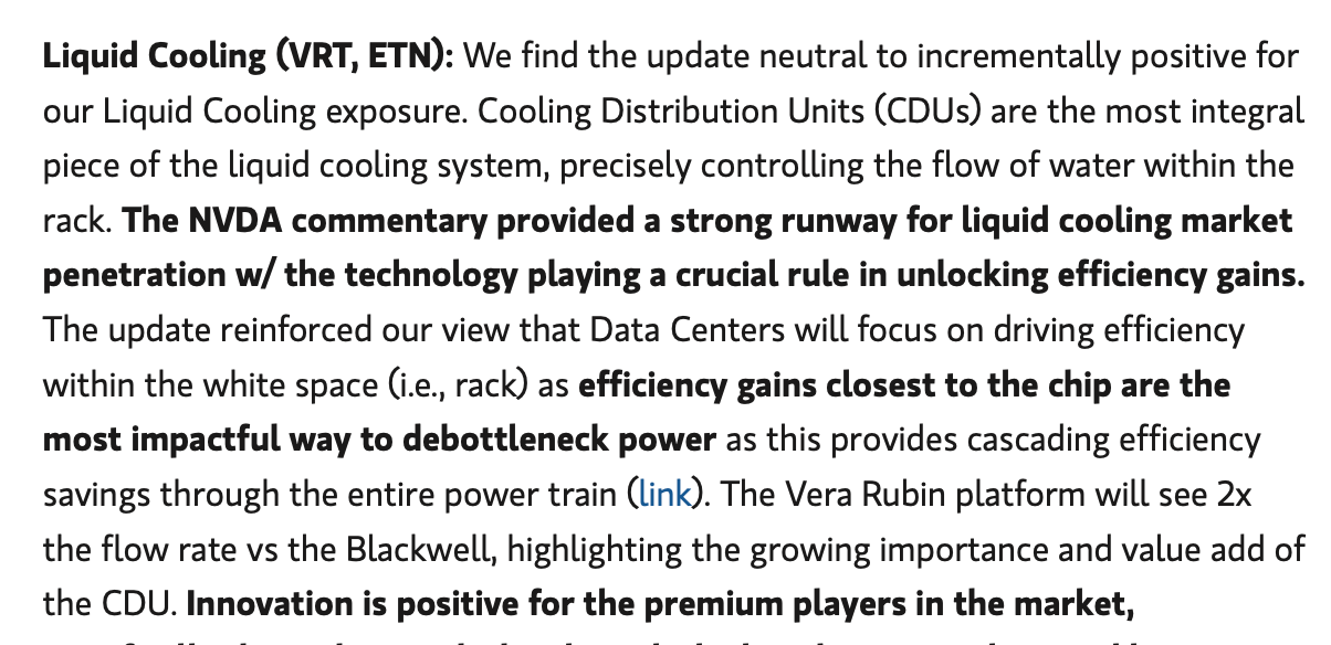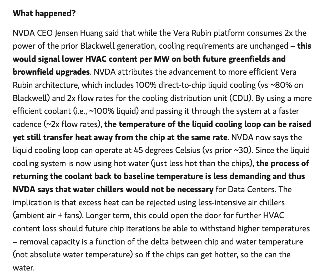 Esasen diyorlar ki, yeni çipler önceki Blackwell neslinin iki katı güç tüketecek ama soğutma ihtiyacı aynı kalacak. Yani megawatt başına HVAC içeriği hem yeni tesislerde hem mevcut tesislerin yükseltmelerinde düşecek.