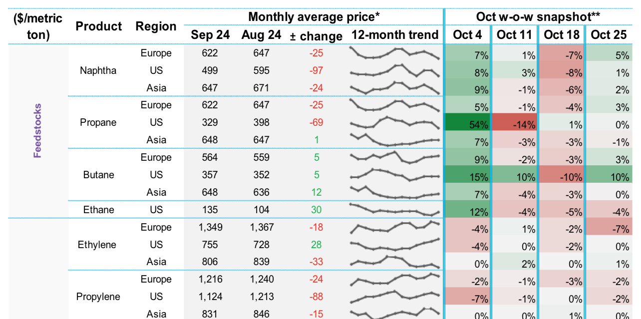 Avrupa'da etilen marjları Ekim ayında zayıfladı. Besi fiyatlarında toplu yükselişler kaydedilirken, ürün fiyatları ters yönde ilerledi.